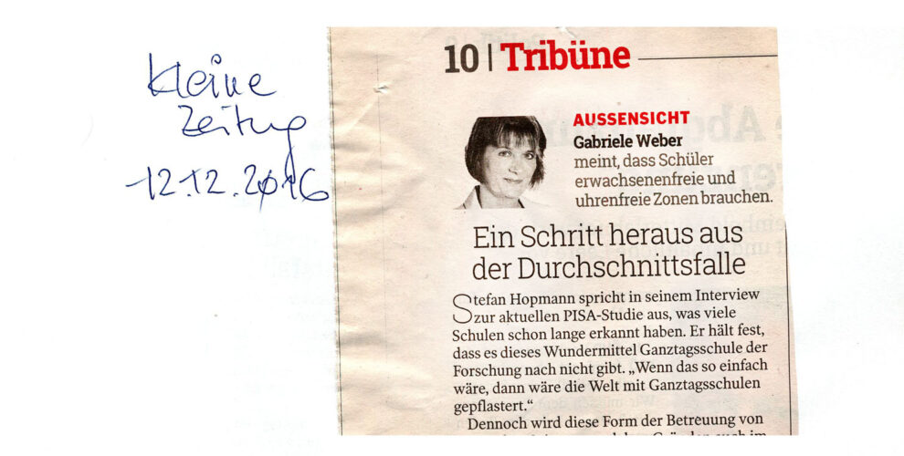 Debattenbeitrag zum Thema Ganztagesschule: Schritt heraus aus der Durchschnittsfalle (Kleinen Zeitung vom 12.12.2016) Jeder Schule soll die Möglichkeit gegeben werden, den Unterricht nach den Bedürfnissen ihrer Schüler zu gestalten. Das starre Korsett einer Ganztagesschule allein kann nicht das Allheilmittel sein.   Zum Nachlesen:  Debattenbeitrag “Schritt heraus